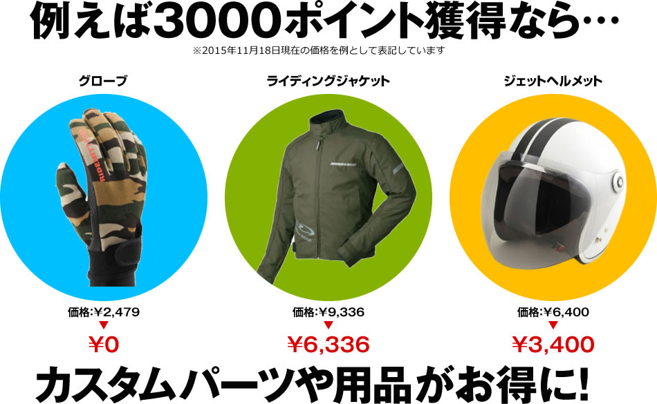 貯めたポイントは、1ポイント=1円相当として「バイクパーツ」や「バイク用品」の通販などでご利用いただけます。